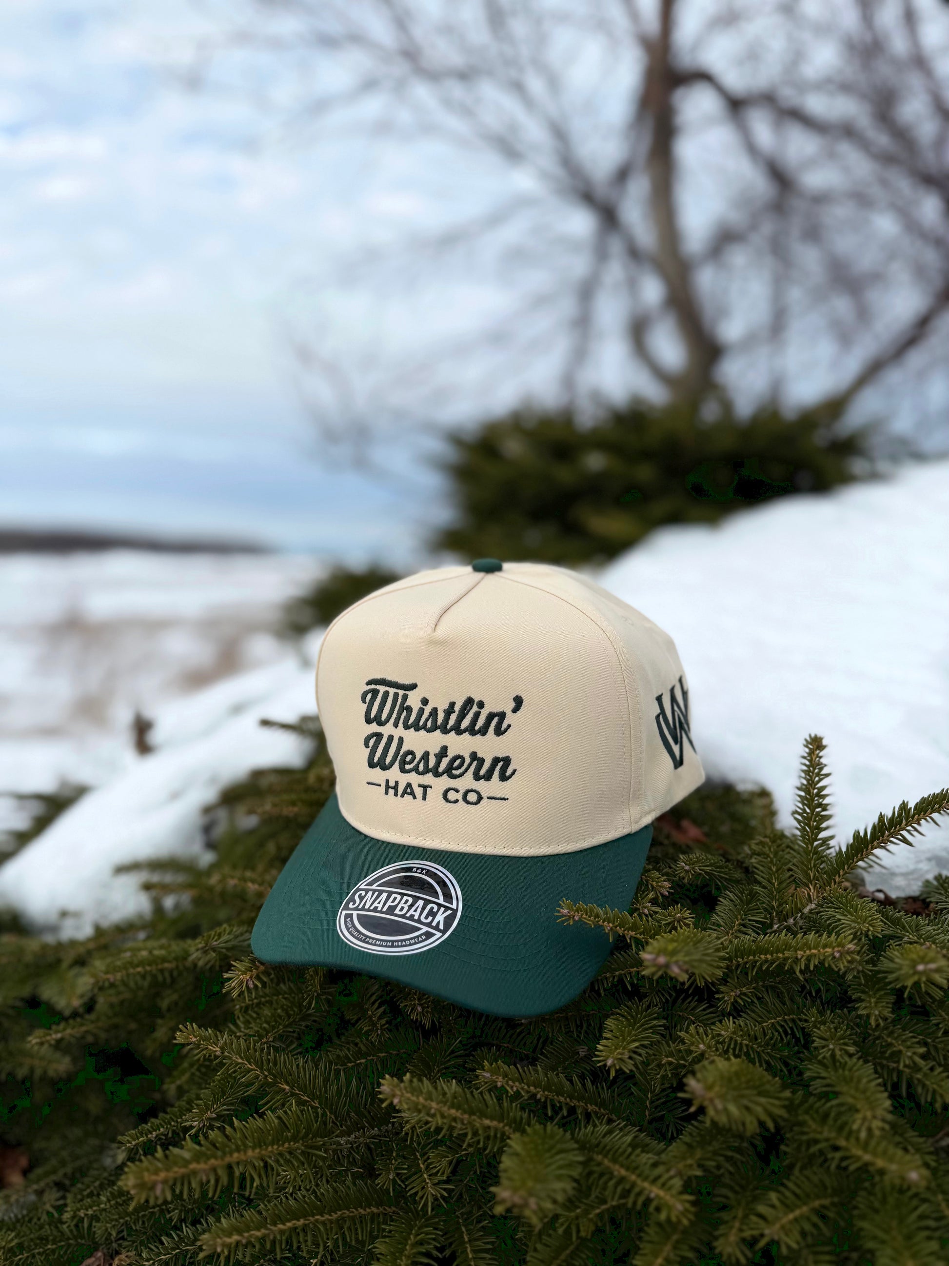 The Pine Ridge Outlaw brings the cool edge of the high country to a classic western snapback. Its pine‑green and sand‑tan build echoes rugged ridgelines and winter trails, while the bold Whistlin’ Western mark keeps your style rooted in the frontier. Simple, sturdy, and made for the ones who don’t shy from the cold — this hat rides with you anywhere.